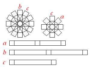 下図のような部品に切り分けてください。棒 a,b は真ん中の正方形で貼り合わせて、十字型にしてください。12 弁の花形には、b,c の端の正方形を交互に貼ってください。8 弁の花形には、c,a の端を交互に貼ってください。